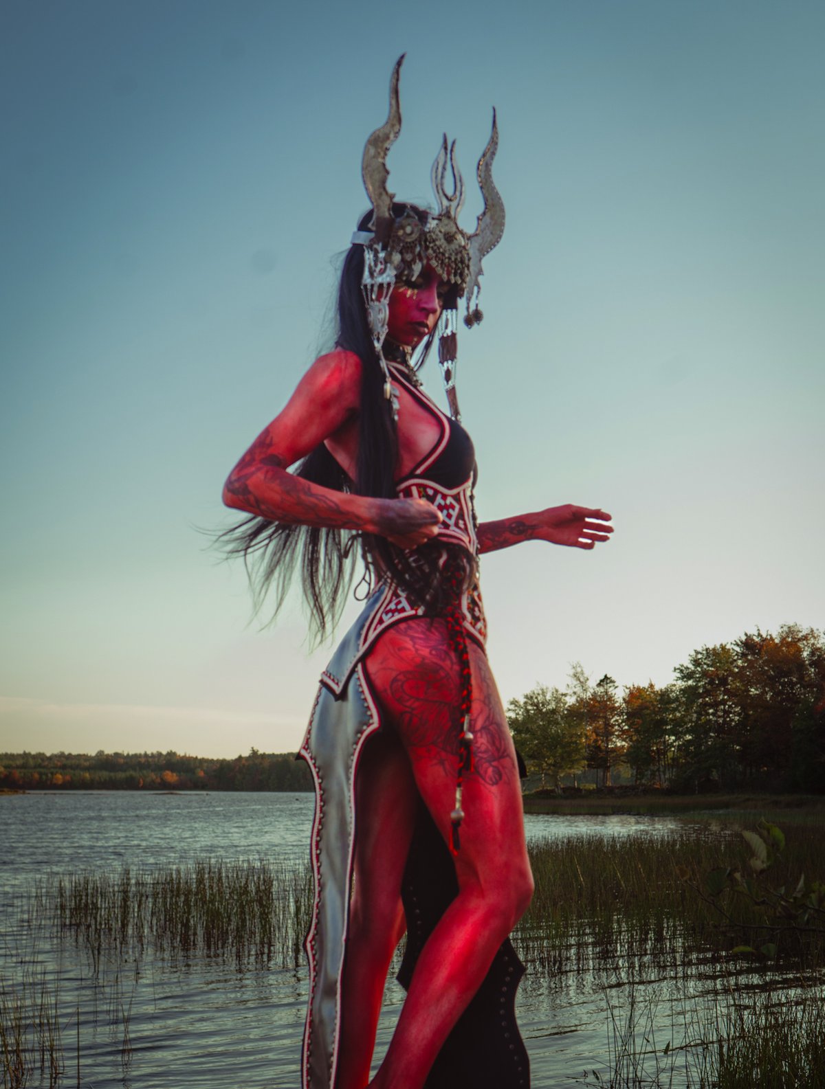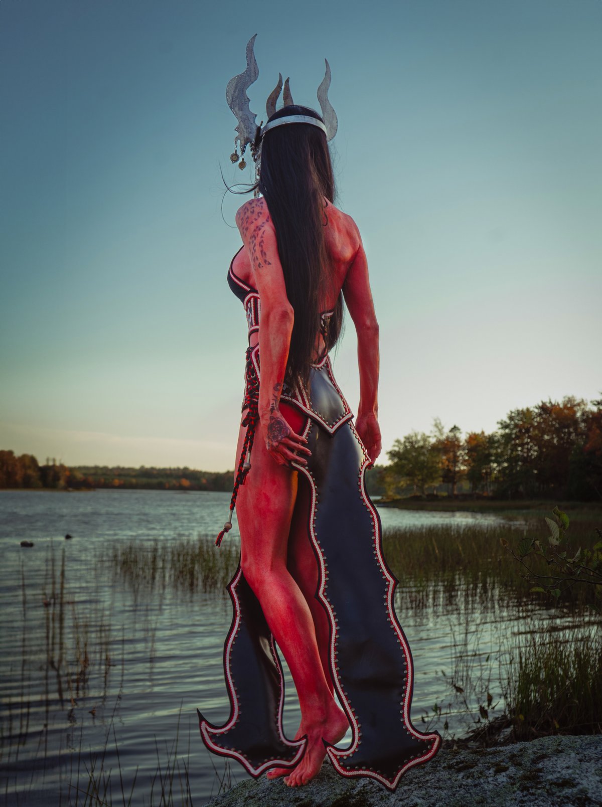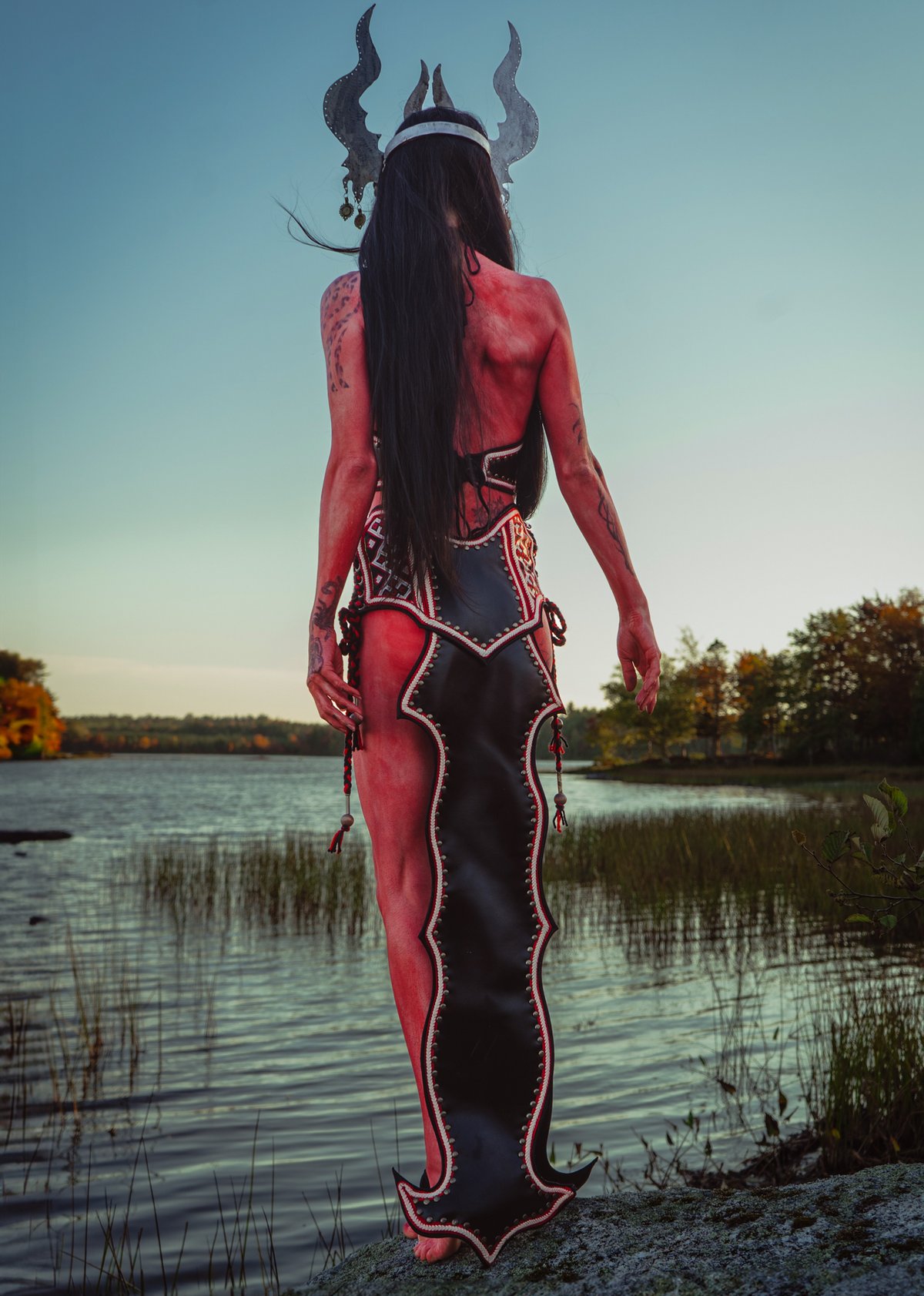 Made from scratch out of black faux leather panelled over black textured fabric with ornate trims and metal detailing all around. Laces up on each side of the panel with braided, beaded yarn- making for a very nice custom fit. Also featuring an antique metal pendant from the east on the front.