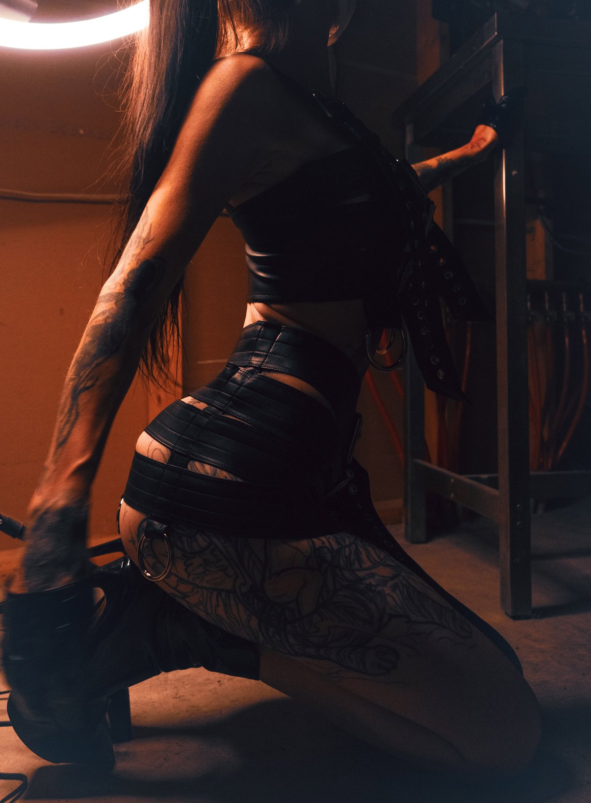 Made from scratch out of black faux leather with tons of adjustable buckles and straps. Each strap is functioning and adjustable! Can be worn on its own or layered over a solid skirt.