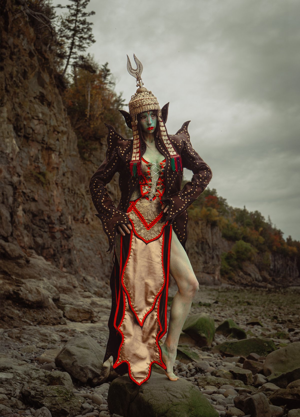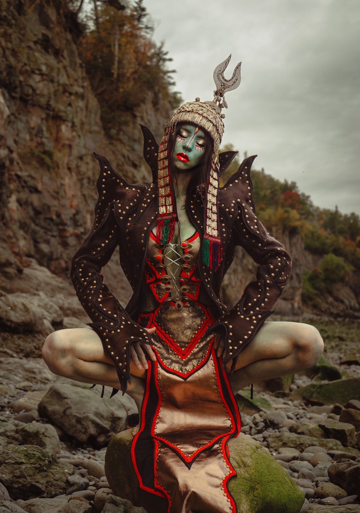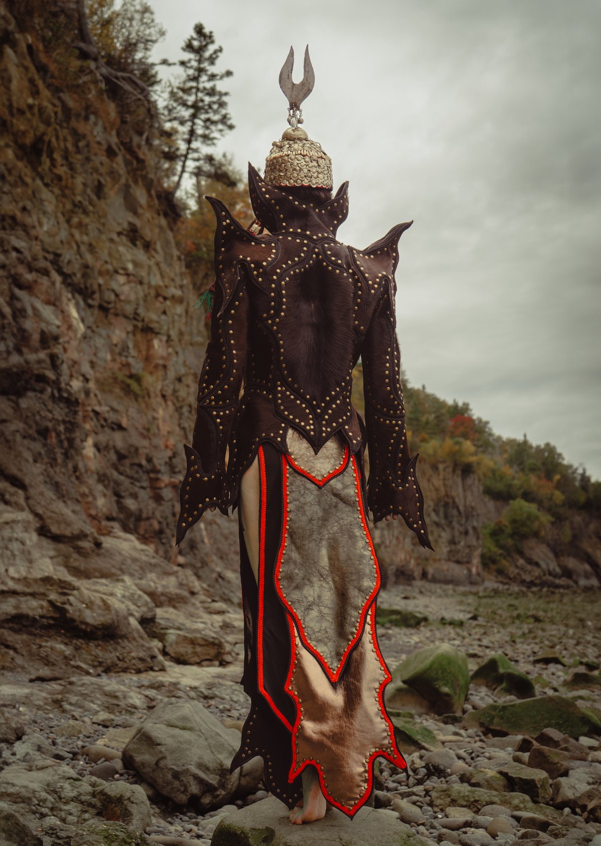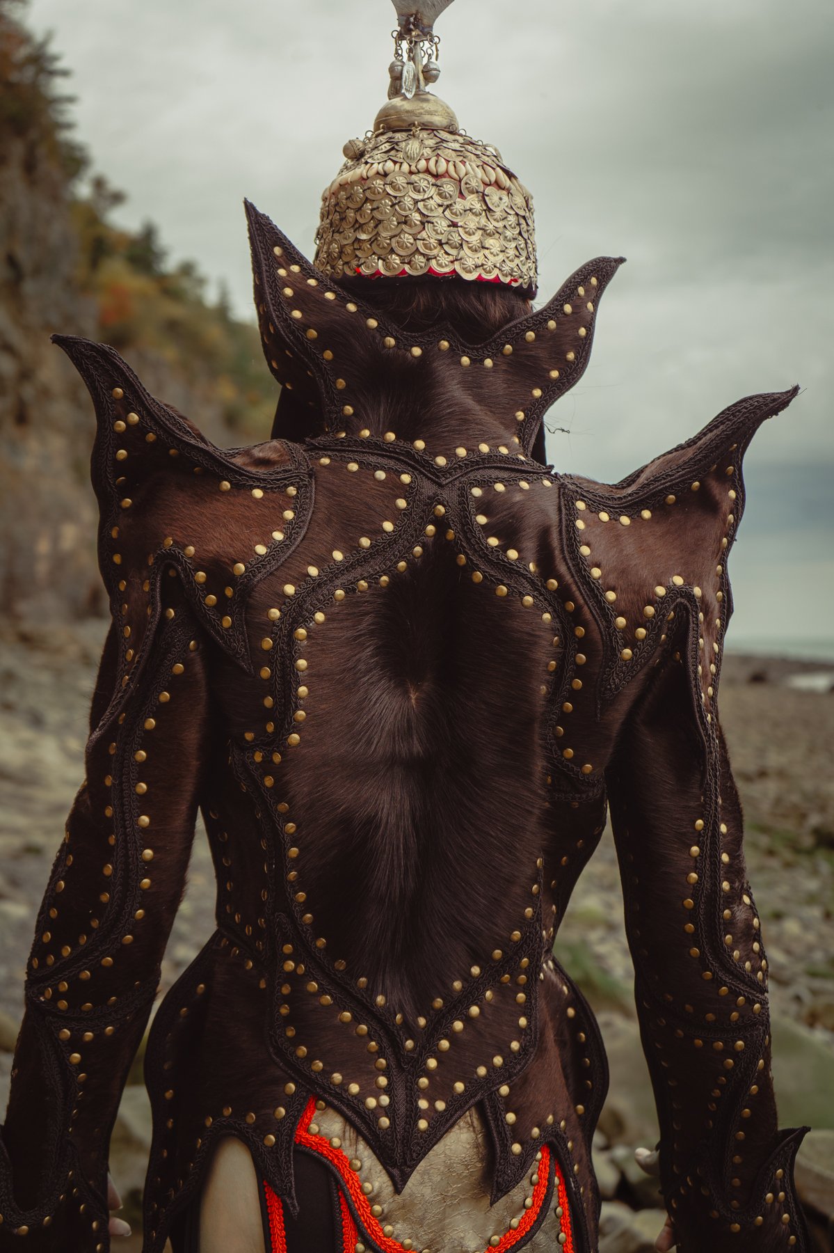 Made from scratch out of hair-on leather panelled over black textured fabric with ornate trims and metal detailing all around.