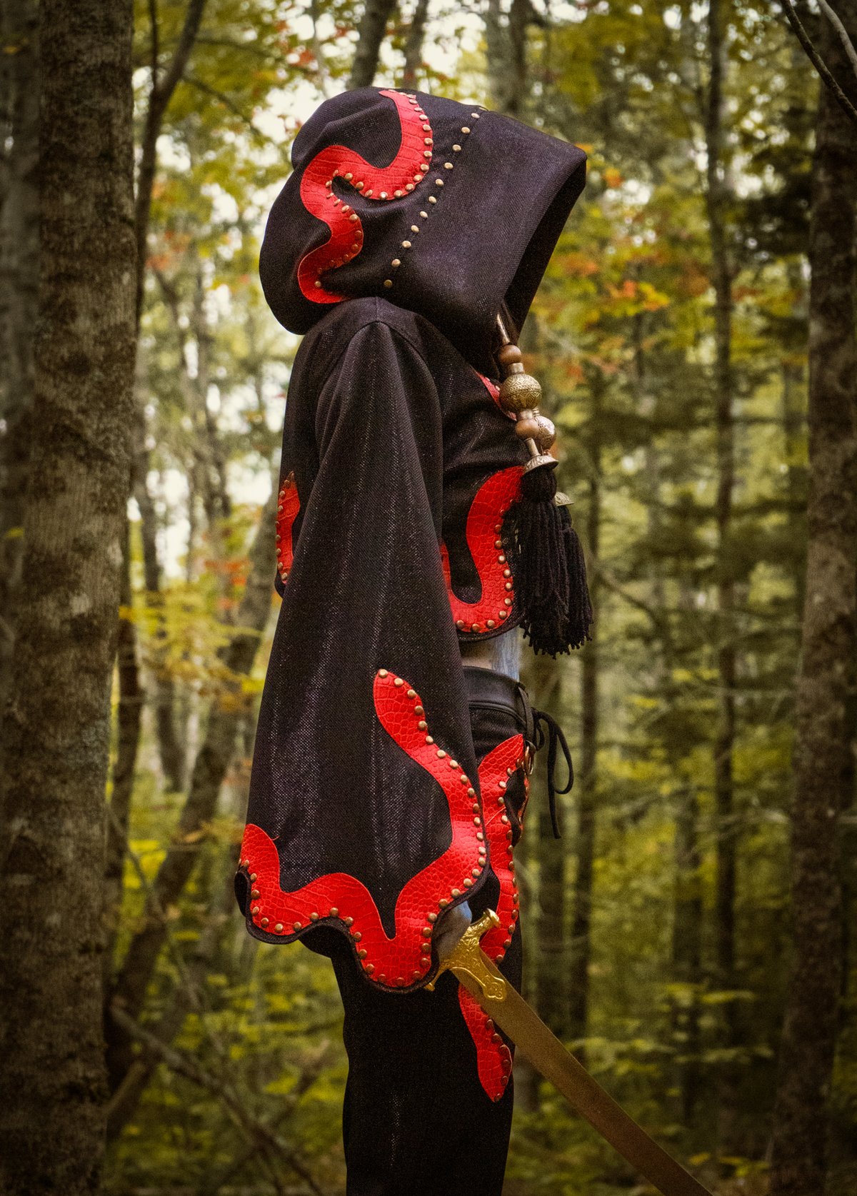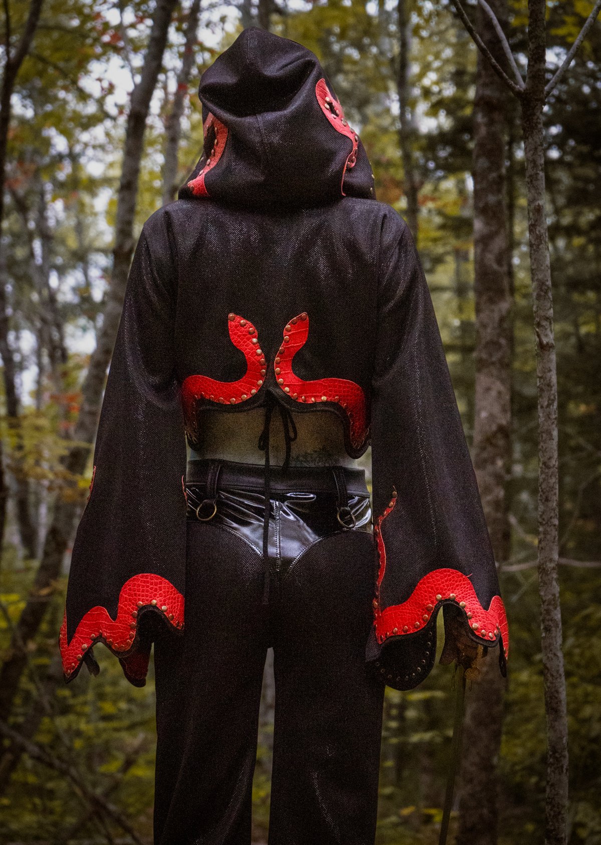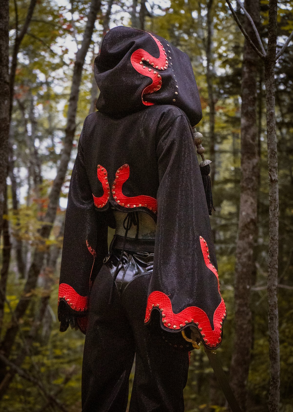Made from scratch out of black textured shimmery fabric with genuine leather snakes appliqued over the base, and metal detailing all around.